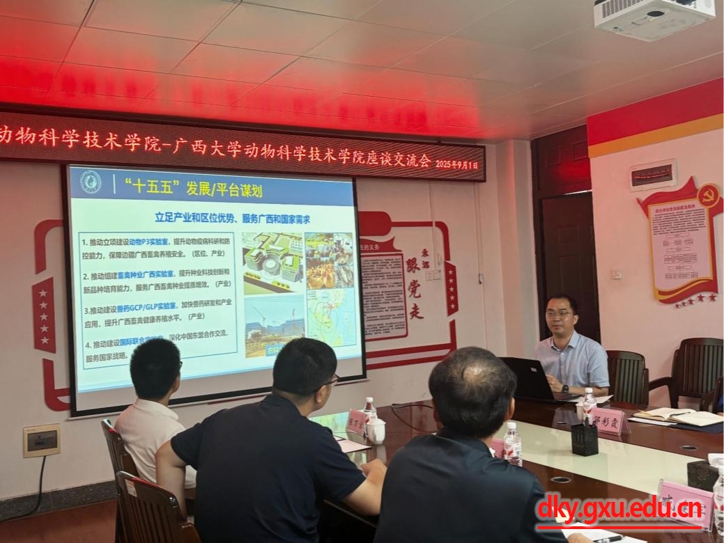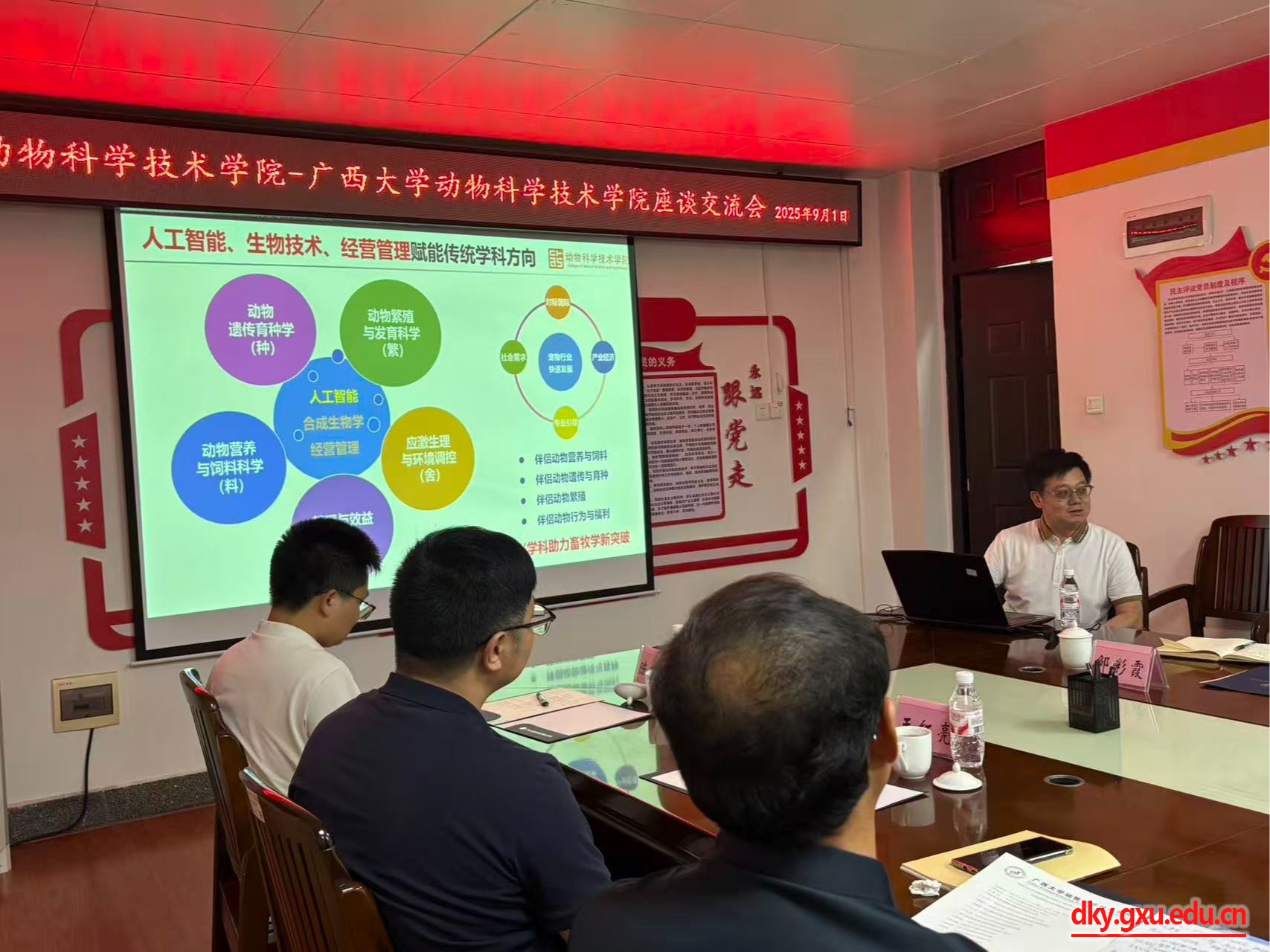 9月1日下午,调研交流会在广西大学动物科学技术学院302会议室举行。陆阳清教授致欢迎辞,并从办学历史、办学规模、师资队伍、专业设置、科研成果及教学特色等方面系统介绍了学院总体情况。同时还围绕“‘十五五’发展/平台谋划”等内容进行分享,与来宾深入交流研讨。