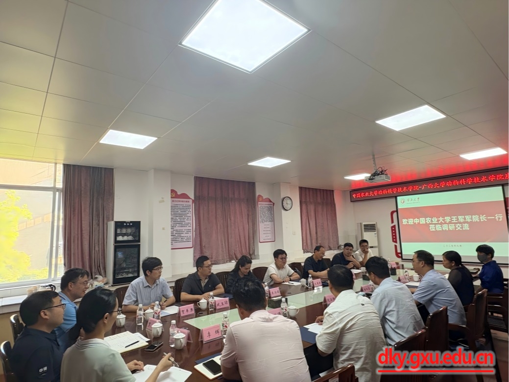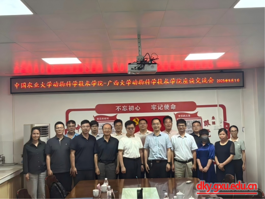 9月1日,中国农业大学动物科学技术学院院长王军军教授、教授级高级畜牧师臧建军、北京攀宝生物科技集团有限公司总裁李满娟女士、中国农业大学资源与环境学院王红亮副教授、动物科学技术学院武玉珺副教授等一行8人莅临我院调研交流。广西大学动物科学技术学院院长陆阳清教授率领赵云翔教授、杨秀荣教授、邹彩霞教授、尹业师教授、系主任李辉副教授、系副主任黄洁萍副教授以及罗栋副教授等人出席座谈会。双方围绕学科建设与人才培养开展深入研讨,共享先进经验,共商协同育人新路径,携手推动学科高质量发展和高层次人才培养。