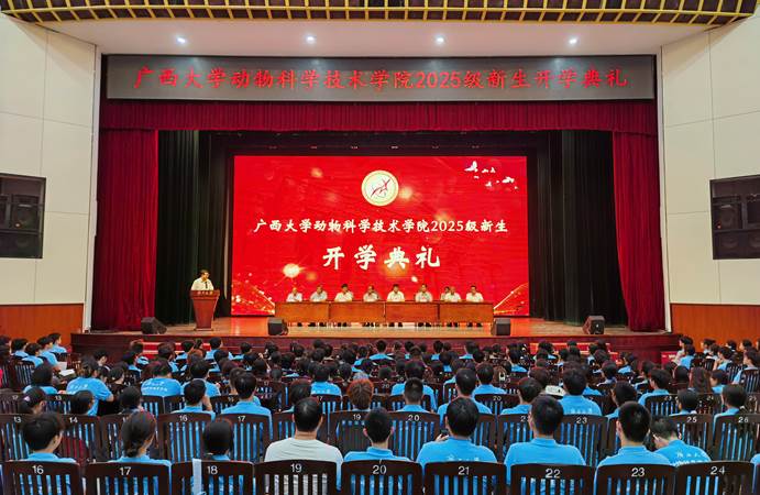 9月17日晚上,广西大学动物科学技术学院2025级新生开学典礼在大礼堂举行。广西大学原副校长、动物遗传育种与繁殖学科著名专家卢克焕,广西大学原副校长、兽医学科带头人罗廷荣,动物科学技术学院党委书记韦小强,院长陆阳清,农牧产业发展研究院院长司红彬,副院长宁鹏飞、韦祖樟、蒋钦杨出席典礼。动物科学技术学院党委副书记、纪委书记沙建主持典礼。知名专家和教师代表、班主任、辅导员以及2025级全体新生参加活动。