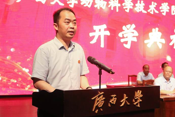 陆阳清院长对2025级新生的到来表示热烈欢迎,并从办学历史、学科建设、师资队伍、人才培养、科学研究、国际交流等方面介绍学院基本情况。他指出,动物科学技术学院深厚的历史底蕴、特色的学科专业、优秀的师资队伍、浓厚的学术氛围、丰富的学习资源是同学们拼搏奋斗的动力源泉,将指引大家明确成长方向、探寻成长道路。他勉励同学们秉承广西大学“勤恳朴诚”校训精神,以“锄头主义”和“三拼精神”深耕畜牧兽医行业的沃土,在建设农业强国的征程中贡献青春智慧和力量!