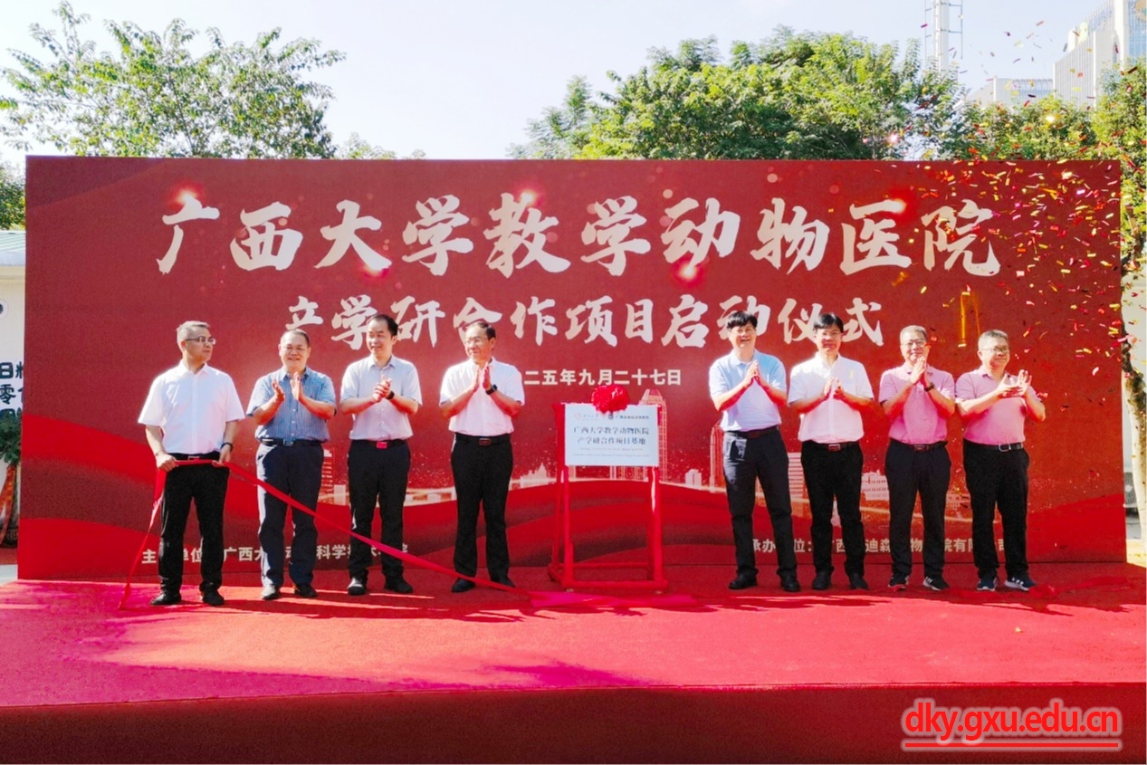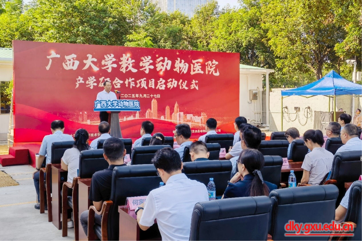 9月27日上午,广西大学举办教学动物医院产学研合作项目启动仪式。广西大学党委常委、副校长于文进,广西大学原副校长、兽医学科带头人罗廷荣,广西兽医研究所所长陈忠伟,百色农业学校校长莫荣军,钦州农业学校校长梁文宇,广西菲赛迪农业科技集团董事长李启平,广西宠物诊疗行业协会会长周华波,以及相关院校师生代表100余人参加仪式。仪式由广西大学动物科学技术学院院长陆阳清主持。