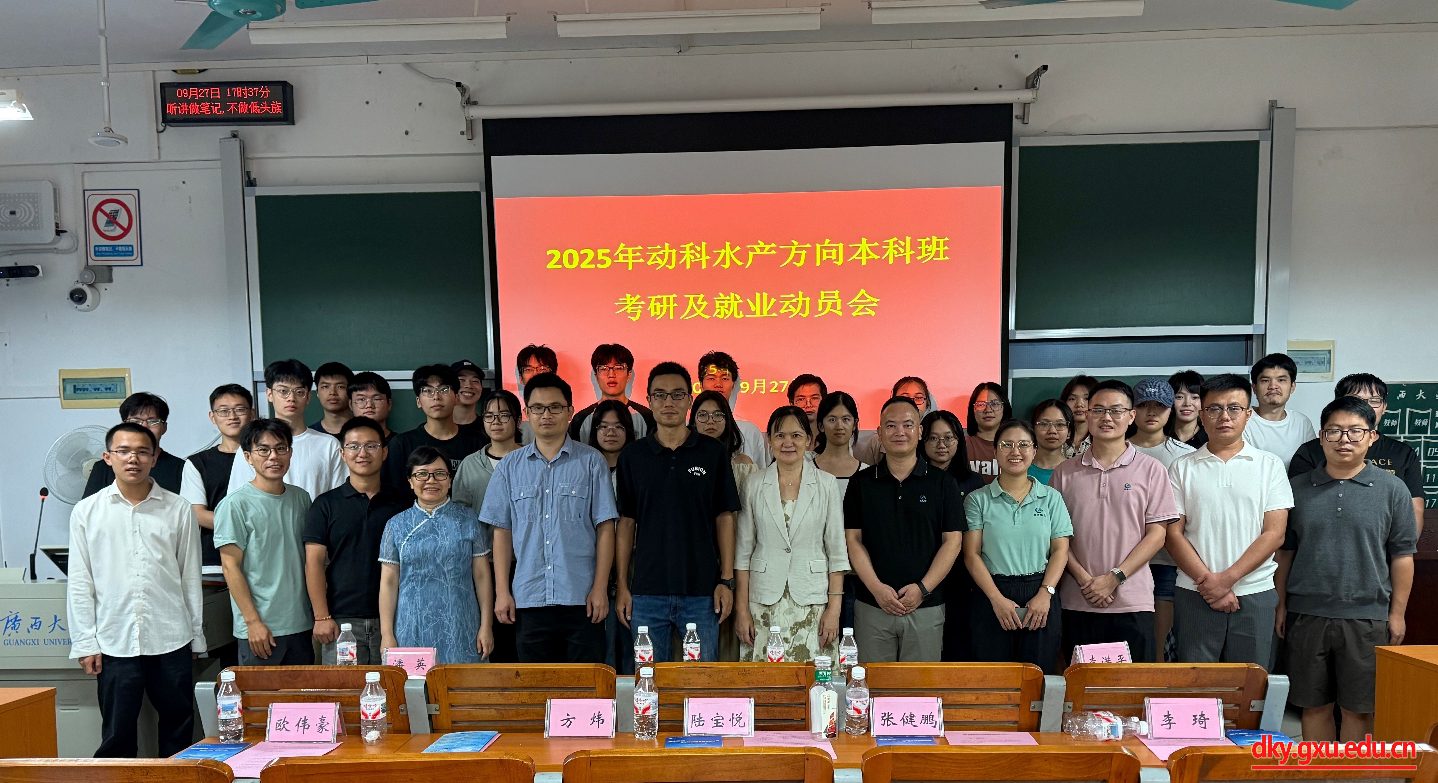 9月27日,广西大学动物科学专业水产养殖方向考研及就业动员会在东六教6A-228顺利召开。海大集团北部湾片区人力总监李满平,湛江海大人事经理曹春玲,技术服务高级工程师于杰,湛江容大人事主管钟一民,动物科学技术学院水产学科带头人潘英,动物科学系副主任黄洁萍、水产学科专任教师以及本科生和研究生参加了此次会议。会议由水产方向第一个本科班“动科224班”班主任欧伟豪老师主持。