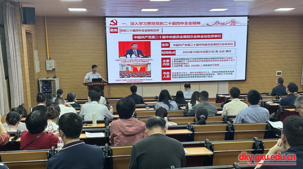 10月29日下午,广西大学动物科学技术学院党委书记韦小强在学院318报告厅,以《向着中国式现代化的宏伟目标 阔步前进、接续奋斗——深入学习贯彻党的二十届四中全会精神》为题讲授专题党课,向全院教职工宣讲党的二十届四中全会精神。
