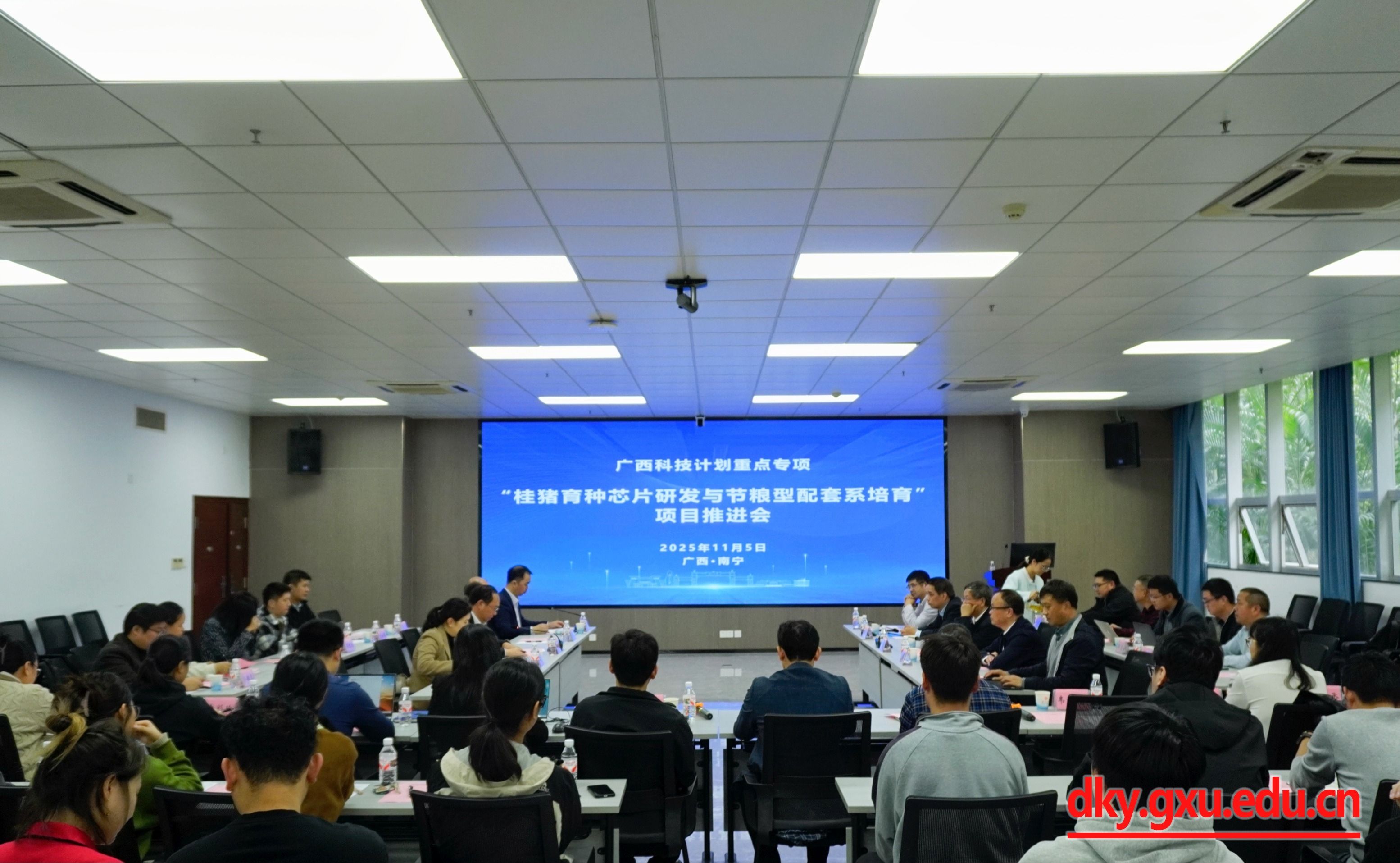 11月5日,我校召开广西科技计划重点专项“桂猪育种芯片研发与节粮型配套系培育”2025年项目推进会。中国工程院院士、中国科学院亚热带农业生态研究所研究员印遇龙,广西大学副校长于文进,自治区农业农村厅科技处副处长王国乐出席会议并致辞。广西大学动物科学技术学院院长陆阳清主持开幕式。广西大学原副校长卢克焕,自治区农业农村厅农垦处一级调研员卢玉发,广西大学科研院项目管理处副处长张敏,广西大学动物科学技术学院副院长何家康,广西大学动物科学技术学院教授、项目负责人赵云翔及来自8家项目参与单位的科研骨干人员参加会议。